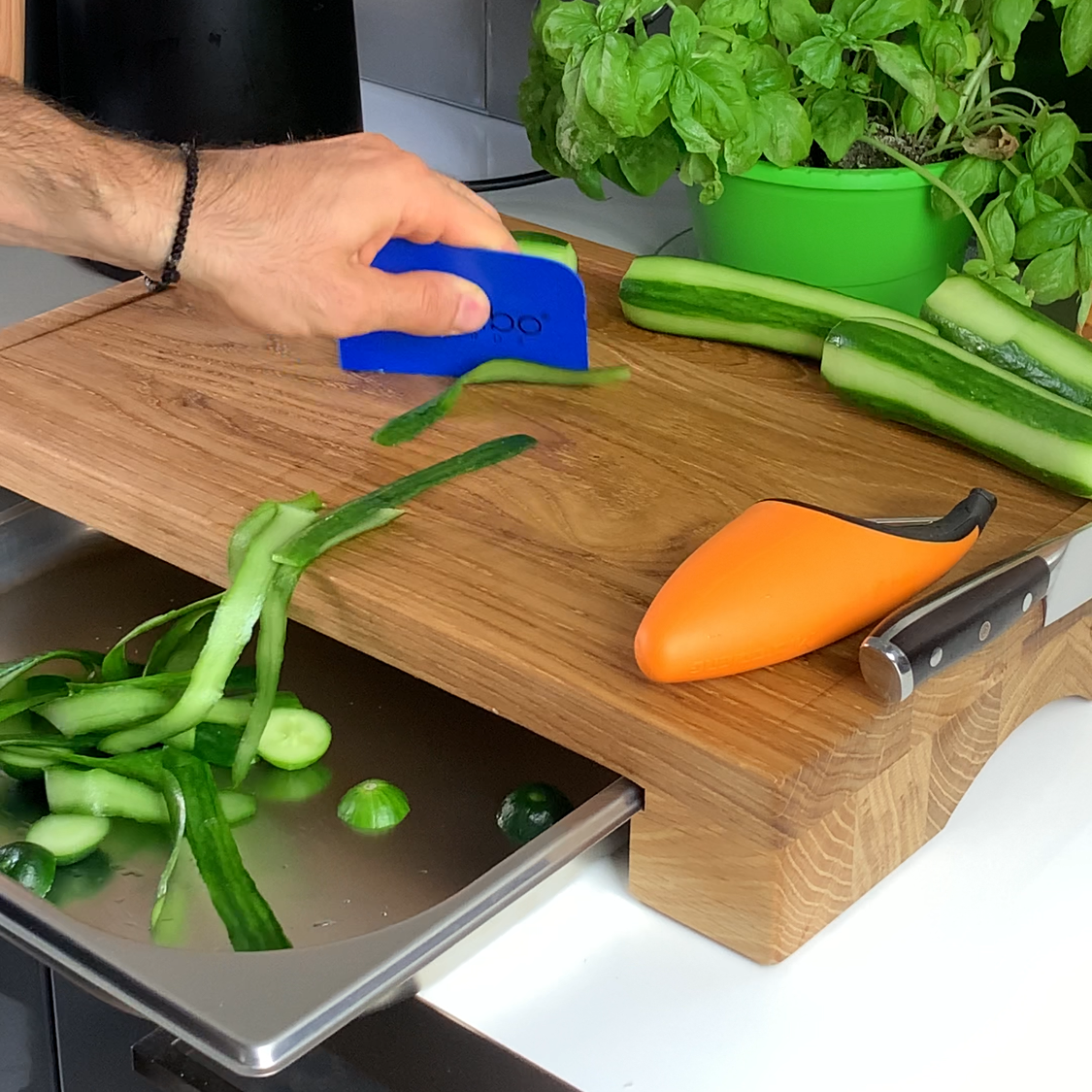 Das cleenbo BigBloc BBQ Oak vereint Funktionalität und Stil in einem großzügigen Format. Das massive Eichenholz bietet eine robuste und extra große Arbeitsfläche für alle Schneidarbeiten – perfekt für Grillfans und ambitionierte Hobbyköche. Die integrierte GN-Auffangwanne aus Edelstahl fängt zuverlässig Abfälle auf und lässt sich leicht herausziehen und reinigen. Die abfallende Arbeitsfläche sorgt dafür, dass Flüssigkeiten aufgefangen werden und nicht über das Brett hinausfließen. Die praktische magnetische Messerhalterung an der Seite hält deine Messer stets griffbereit und sicher verstaut.