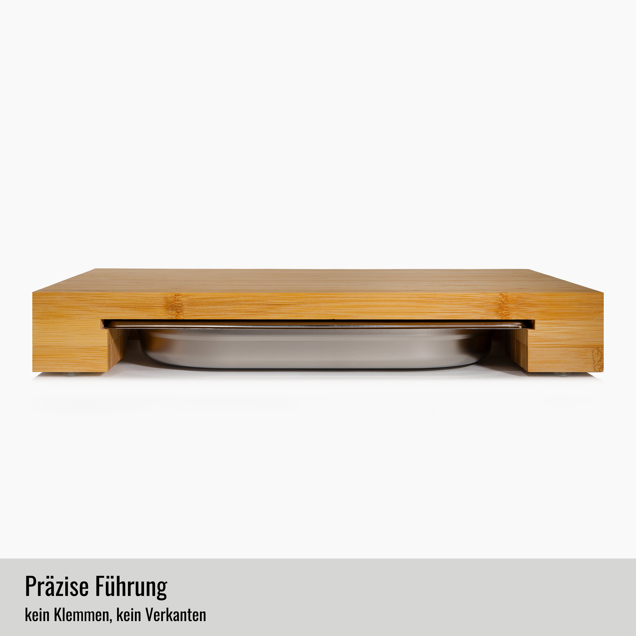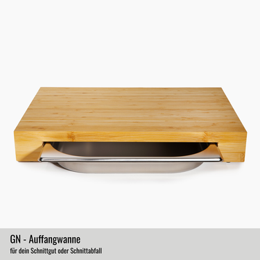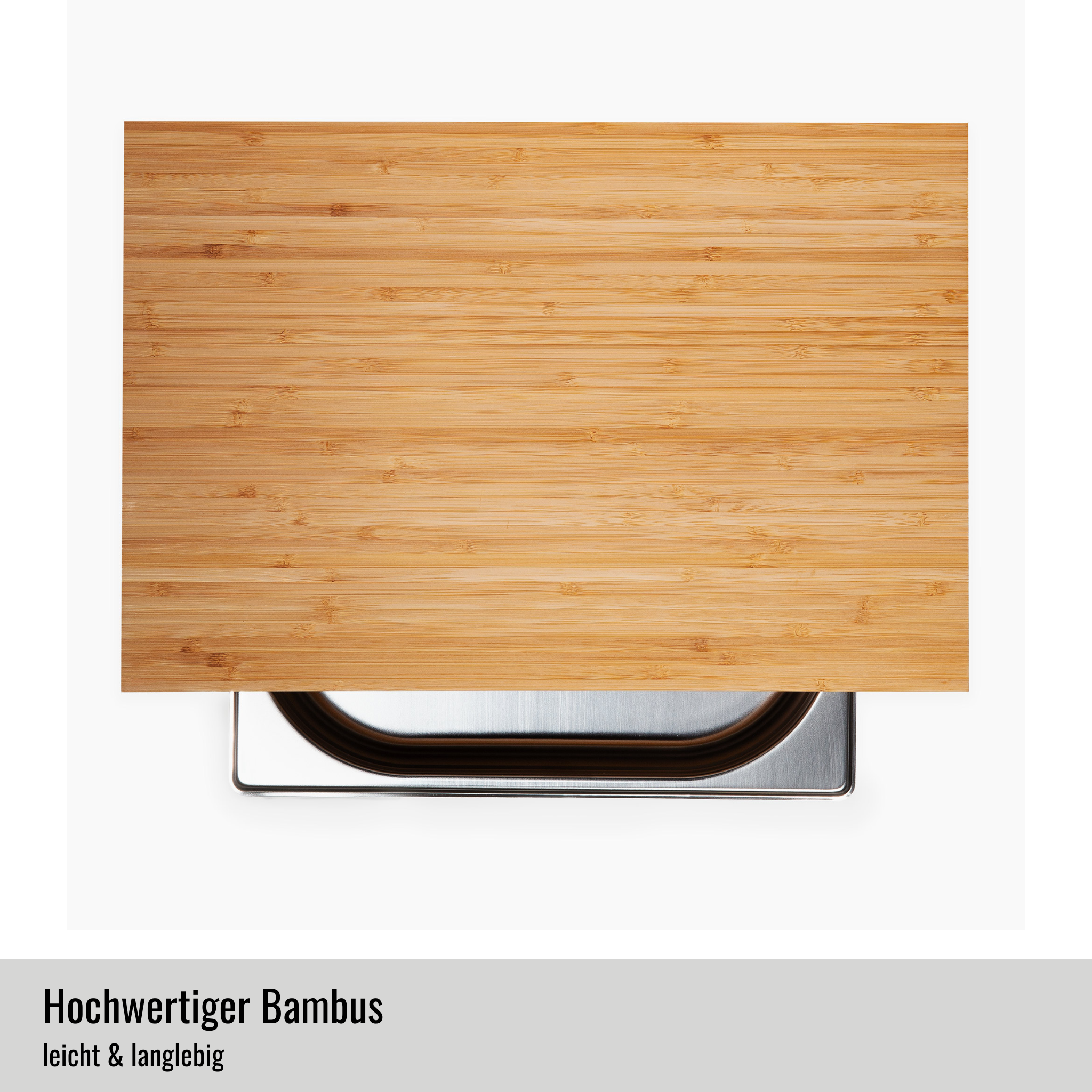 Unser cleenbo cube bamboo mit integrierter GN-Auffangwanne aus Edelstahl erleichtert dir die Küchenarbeit enorm. Die Bambus-Arbeitsfläche bietet viel Platz zum Schneiden, Schälen und Zerlegen. Die herausziehbare Auffangwanne fängt Abfälle auf und lässt sich leicht entleeren. Die GN-Wanne ist spülmaschinengeeignet und ofenfest, ideal für den vielseitigen Einsatz in Profi- und Hobbyküchen.